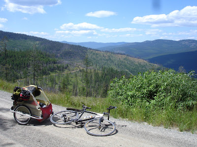 The "To Yaak and Back with the Dog in the Trailer" bike tour went off without a hitch; oddly, nothing went wrong other than a cut on my finger, a sunburned nose, and a lot of mosquito bites. Five days, 240 miles pedaled, 8 walked (two climbs, one about eight miles long, the other about 13 and at times incredibly steep, were just too much for my knees), 13,000 feet climbed, about 90 lbs. pulled. The trailer actually made it. Cody didn't get heat stroke. I didn't even flat once. Awesome.